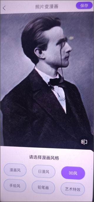 2、在相册中选择一张照片,然后选择漫画的风格,弄好之后点击右上角的保存按钮即可。