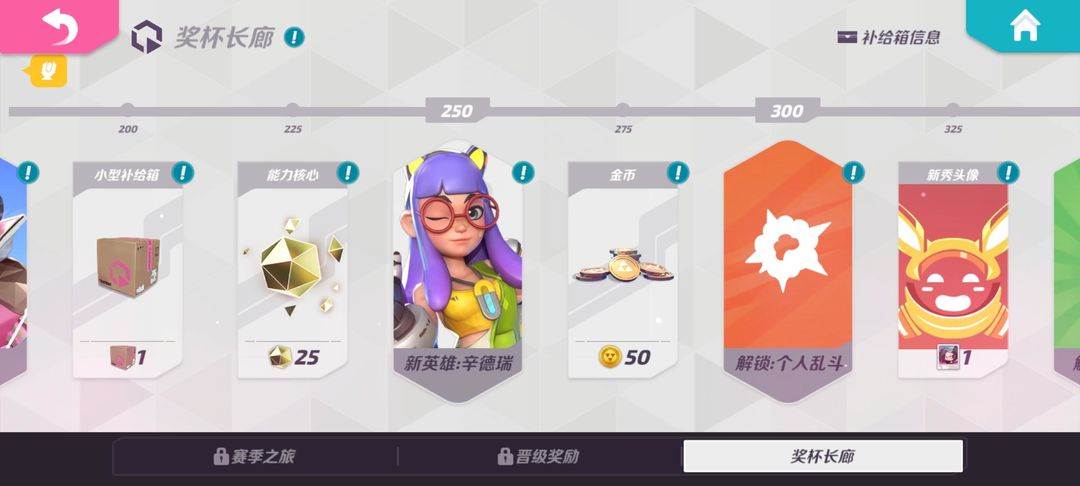 在奖杯达到1000杯可以在奖杯长廊领取英雄红,这个英雄也很简单又强。一技能释放时生成向前移动的三个盾,能阻挡火力,同时红自身贴脸输出不低,二技能和大招的伤害都不错。