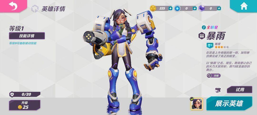 如果开宝箱幸运的开出暴雨那也可以练,毕竟谁不喜欢一秒20发的加特林,开启一技能还有减伤,二技能能增强输出能力,大招还能原地生成个球体屏障保护自己,除了移速慢不灵活,现在的暴雨当是最好的选择。