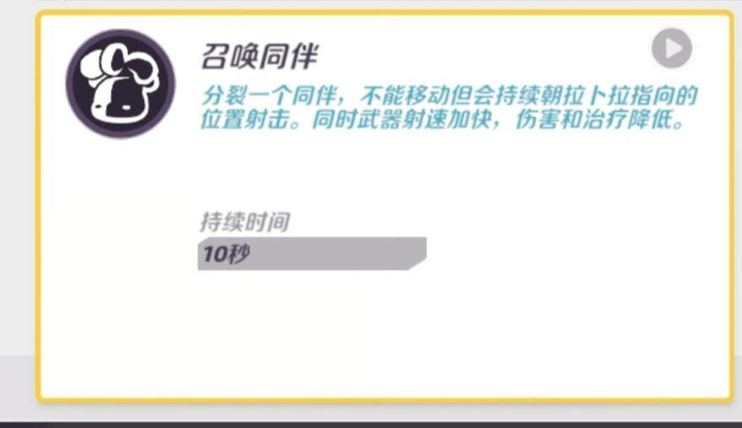 ●大招会召唤一个不能移动的分身,可以被摧毁。技能期间大幅提高分身和自身的射速,分身会朝准心方向攻击,对着队友也可以回血,但是回复量会降低,团战中让准心对着队友可以提高回血频率,让队友有更好的输出空间。