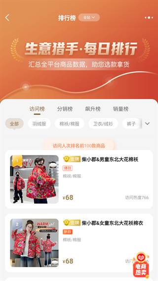6、每日排行,捕获趋势:获取热销头部商品,整合三方电商数据,助您精准选款,事半功倍。