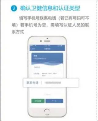 2、确认卫健信息和认证类型填写手机号联系电话(若已有号码可不填)