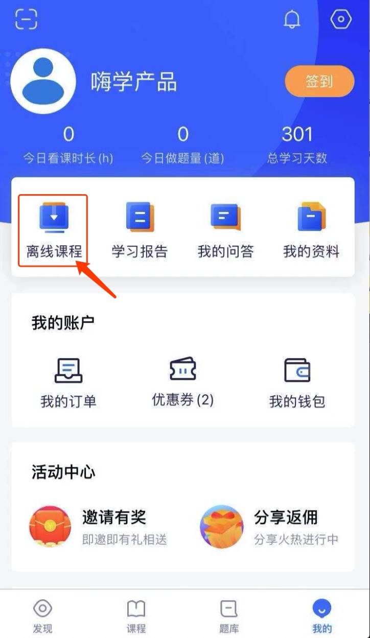 6、缓存成功后,请点击页面右下方的“我的”按钮,跳转至“我的”页面。再点击“离线课程”按钮,即可查看已完成缓存的视频。