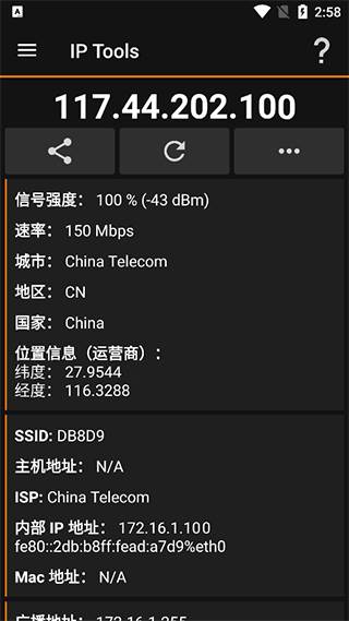 IP工具具有简单直观的界面,因此您可以在几秒钟内收到网络上的完整信息,查找内部或外部IP(“我的IP”功能),SSID,BSSID,广播地址,网关,网络掩码,国家,地区,城市,提供者的地理坐标(经纬度),whois等基本信息。