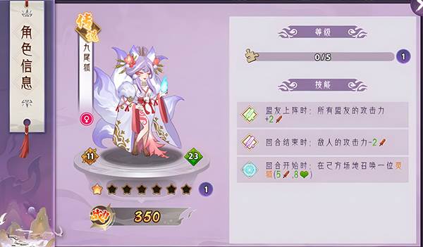 九尾狐:当盟友上阵时,可对所有盟友增加攻击力。自身每回合还可召唤一只灵狐。