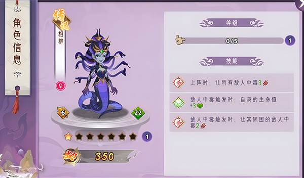 相柳:上阵群体中毒,触发毒伤增加自身生命,并且还可以蔓延毒素,在敌方数量较多时上阵可起到非常不错的效果。