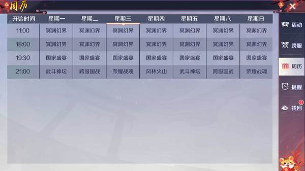 5、上面稍微讲完了等级和装备,那么下面就讲下限时活动拉~限时活动通常是能够拉开玩家差距的地方,限时活动主要包括了冥渊幻界,国家盛宴和晚上9点的活动。这个游戏整体还是比较良心的,就是不用太肝,在玩过了很多游戏之后,会发现有些游戏基本每隔一个小时就要上线一次。冥渊幻界是一个限时BOSS本,国家盛宴主要是提供经验加成的地方,而每天9点的活动是一个新玩法活动,这个玩法最好都能参与,因为提供的奖励真的比较丰厚,实在没时间参与也可以通过第二天寻回,所以也不用担心。其中武斗神坛和荣耀战魂是PVP的玩法,可以跟跨服的玩家PK,一决高下。跨服国战是国战玩法,不同服的国家互相PK,占领城池;风林木火是公会玩法,不同公会PK,决胜出最强公会,公会会长还有额外的奖励哦!