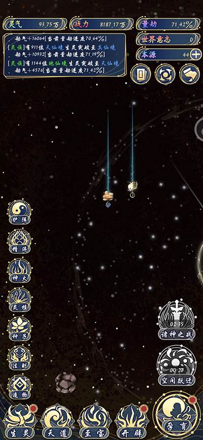 2、游戏目前有孕育、开辟、天道、至宝、生灵等玩法;