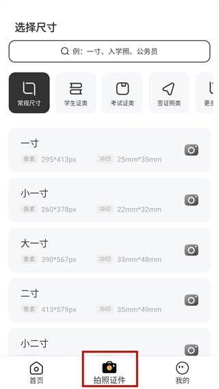 3、在拍照证件板块可以选择具体的尺寸和类型。