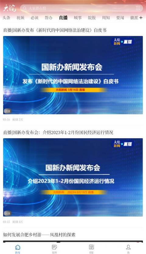 1、进入软件首页,可以看到新闻头条、新闻快讯、必读、直播等