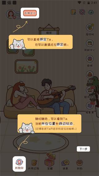 1、在本站下载安装后,登录软件,可以在软件内左上角去绑定自己的另一半;点击“找到你”可以随时随地的看到对方所在的当前位置和移动轨迹
