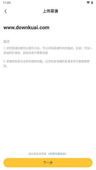 4、在文本框中填写菜谱的标题后,点击下一步的选项。
