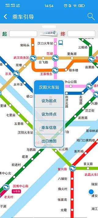 点击"乘车引导"栏目,进入乘车引导主界面,显示为地铁线路图;在线路图中点击任意一站,即可弹出设置窗口,选择"乘车信息",