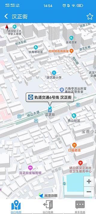 点击"乘车引导"栏目,进入乘车引导主界面,显示为地铁线路图;在线路图中点击任意一站,即可弹出设置窗口,选择"出口信息",系统自动跳转到出口信息详情页面,可以查看该站点出口所在街道的位置。
