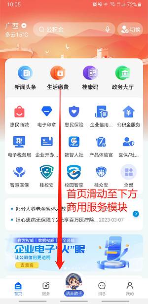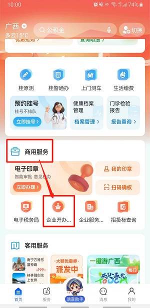 步骤二:在“智桂通”APP首页下滑至商用服务模块,找到“企业开办一窗通”应用