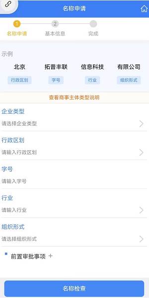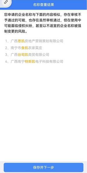 步骤五:按顺序选择企业类型、行政区划、行业和组织形式,输入字号后点击【名称检查】,查看查重结果,确认无误后点击【保存并下一步】