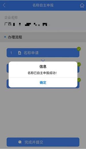 步骤八:确认无误后点击【完成并提交】,名称申报成功如图所示