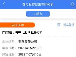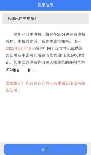 步骤九:名称申报成功后点击【返回】,点击【设立登记】,进行设立信息填报