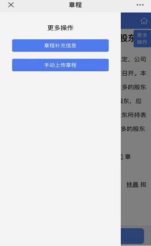 步骤十二:章程信息——点击章程界面右上角【更多操作】,补充章程信息(自动合成时填),如果自动合成的章程不符合要求,可选择手动上传章程。