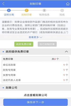 步骤十六:刻章信息,可选 政府免费印章 和 自行刻制印章,提交刻章后,数据通过后台传送到公安刻章平台。