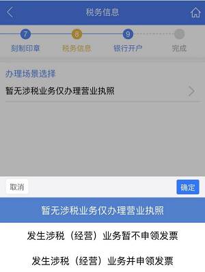 包括【暂无涉税业务仅办理营业执照】、【发生涉税(经营)业务暂不申领发票】、【发生涉税(经营)业务并申领发票】三个业务场景。