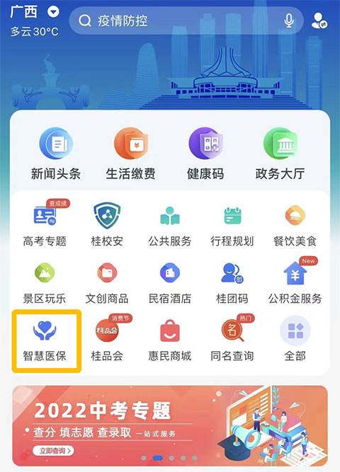1、先进入“智桂通”APP,在首页“民用服务”频道即可看到“智慧医保”应用。
