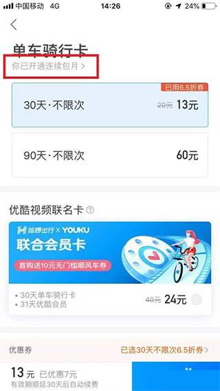 4、进入“单车骑行卡”续费页面,在该页面的单车骑行卡下方有提示“你已开通联连续包月”字体,选择并打开该选项。