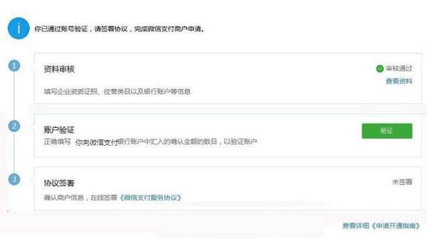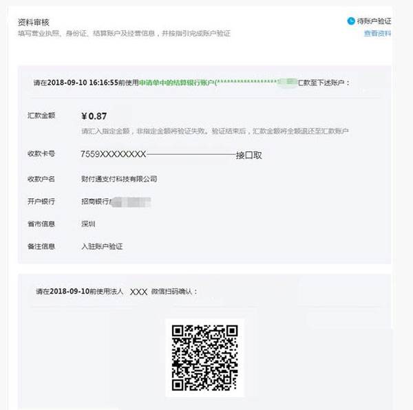 3、微信审核通过后,开始进行账户验证,按照步骤,使用主体对应的账户 <向财付通支付公司汇一笔指定的金额> 款项,