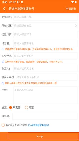 3、填写好就可以点击页面最下方的下一步,再按步骤操作即可完成义乌购开通卖家功能了。